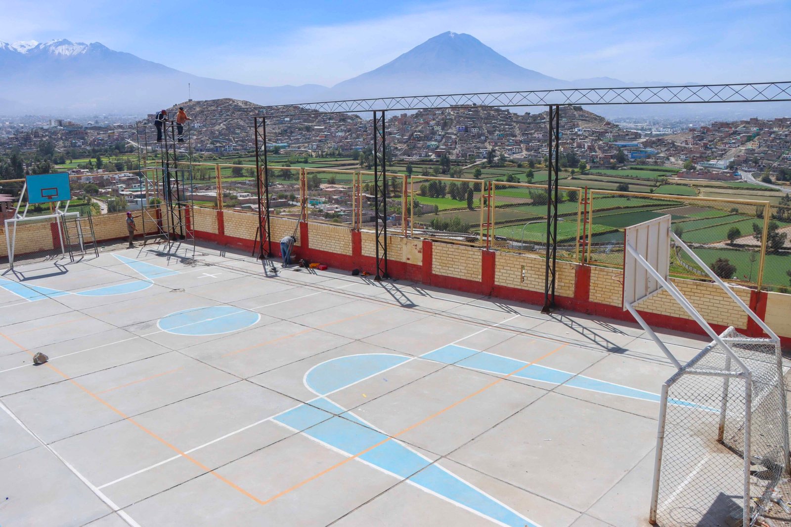 Las labores comprenden el pintado total de la losa deportiva, así como el mejoramiento de los arcos de básquet y de fútbol, que presentaban desgaste por el paso del tiempo. Asimismo, se realiza el cambio de las estructuras metálicas que sostenían la malla raschel, dado que cumplieron su ciclo de vida útil, instalándose nuevos soportes que garantizarán mayor seguridad y resistencia para los usuarios del recinto.